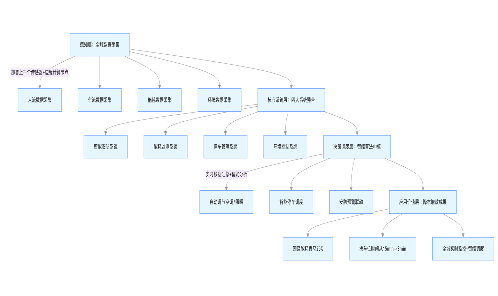 整合智能安防、能耗监测、停车管理、环境控制四大系统,通过传感器与边缘计算实现园区人流、车流、能耗全域数据互通,打破系统壁垒,构建统一数据底座。